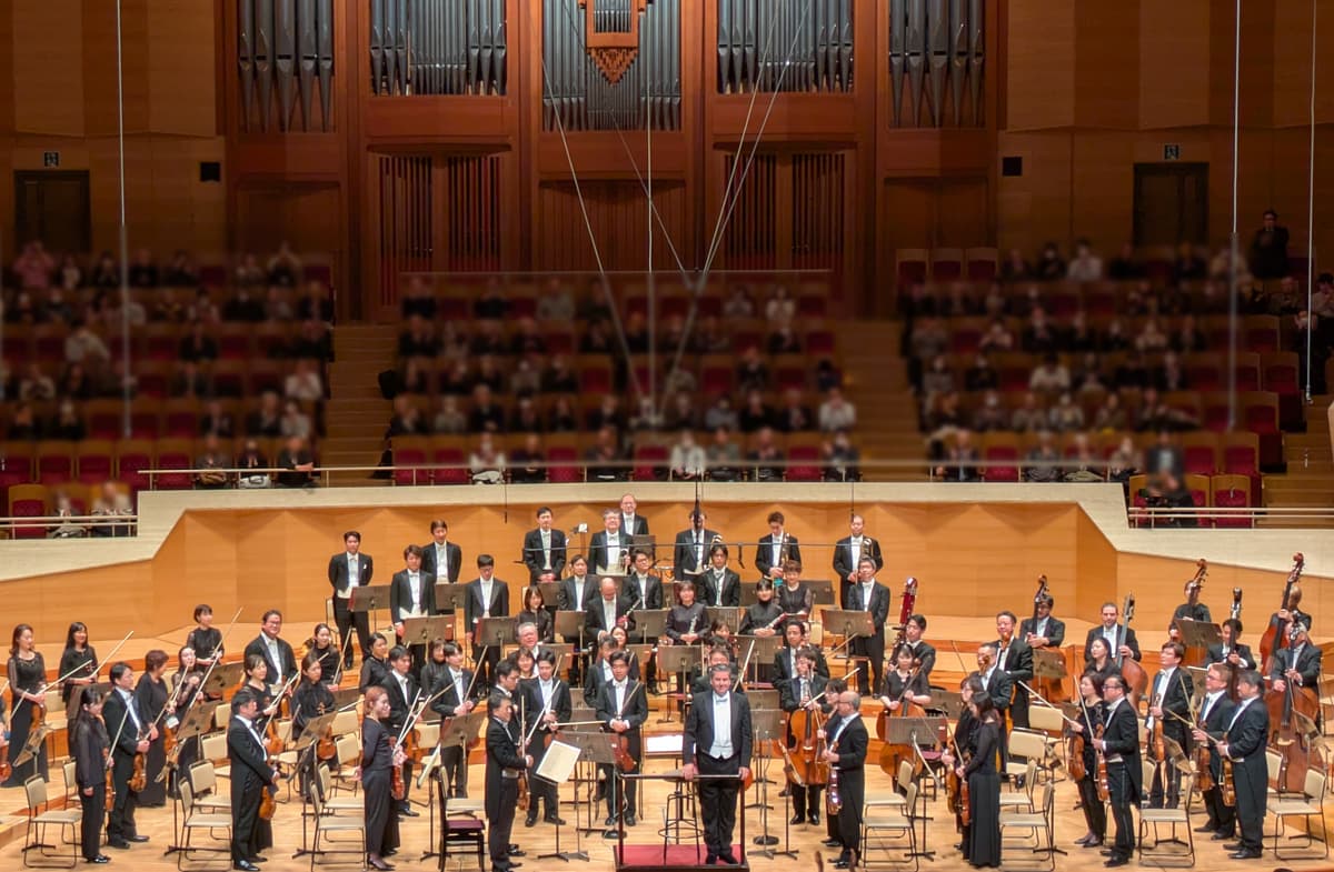 ●悲劇的序曲は冒頭から気迫のこもった鋭い音。曲が渋いからなのか、演奏会では意外と聴けない曲。さらに渋味が魅力の二重協奏曲へと続いて、漆黒のロマンティシズムを堪能。二重協奏曲では第1コンサートマスターの林悠介、ソロ・チェロの遠藤真理がソロを務めた。ともに楽団員とあってオーケストラとの調和はさすが。大きな室内楽を聴くかのよう。ソリストアンコールではコントラバス用の椅子が指揮台の前に置かれ、なにが始まるのだろうかと思ったら、なんと、ブラームスの間奏曲作品118-2。晩年のピアノ曲のなかでもとりわけ憂愁の色濃い名曲だが、ソリストふたりに少人数の弦楽器が加わった編曲で。だれの編曲なのかと思って休憩中にアンコールの掲示を見たら、首席第2ヴァイオリン奏者の石原悠企編。絶品だった。
