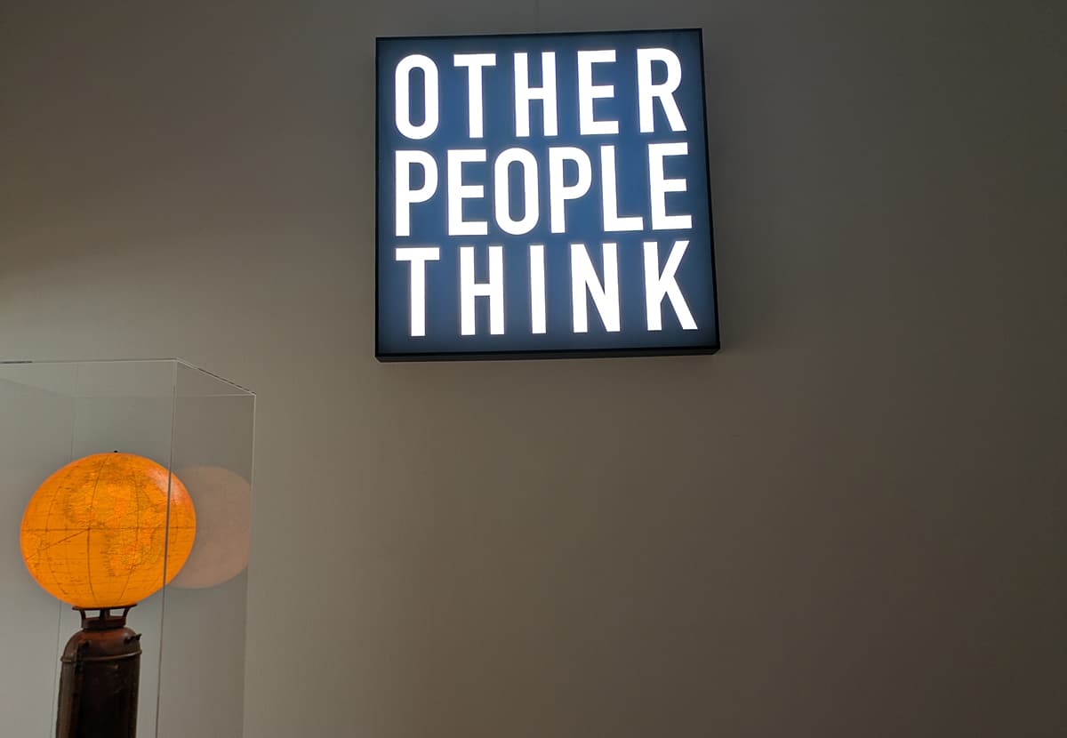 ●で、これは音楽ファンにも気になる作品だと思うのだが、「彼らにも考えがある」(2012)。手前の丸いオレンジ色は別の作品で(スマソ)、後ろのライトボックスに OTHER PEOPLE THINK と書かれているのが本作。これはジョン・ケージ生誕100年を記念して作られた作品で、ケージが15歳の頃にハリウッド・ボウルでのスピーキング・コンテストのために書いた演説文にちなんでいる。ケージの意図はともかくとして、この作品では「彼らにも考えがある(自分たちだけじゃなくて)」っていうニュアンスが込められている、らしい。文面からは別の受け止め方もありそうだが。
