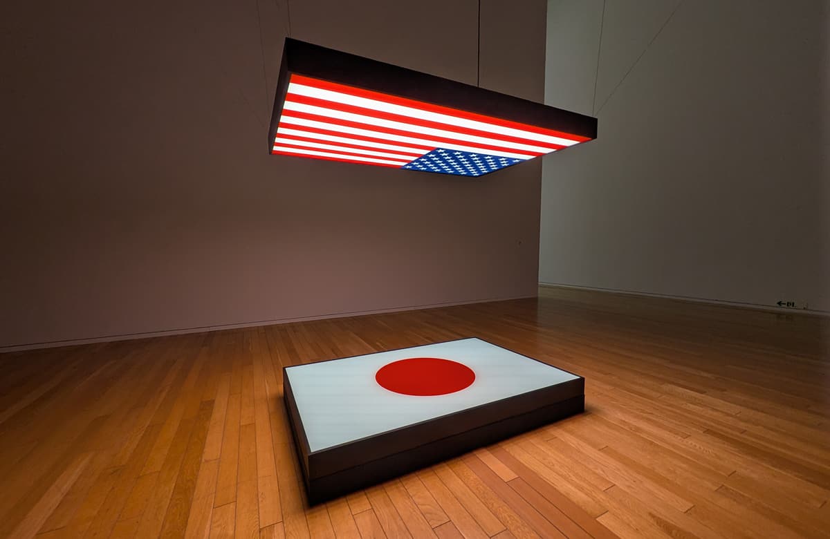 ●日本を題材とした作品もふたつほどあった。これは「明日は明日の日が昇る」(2025)。ふつうの高さから見ると、床のライトボックスに日の丸があるのが見える。でも、近づいてのぞき込むと、上に星条旗があることに気づく。日米の非対称性がここに。ほかに「ヒロシマ、ヒロシマ」という大掛かりな作品も。