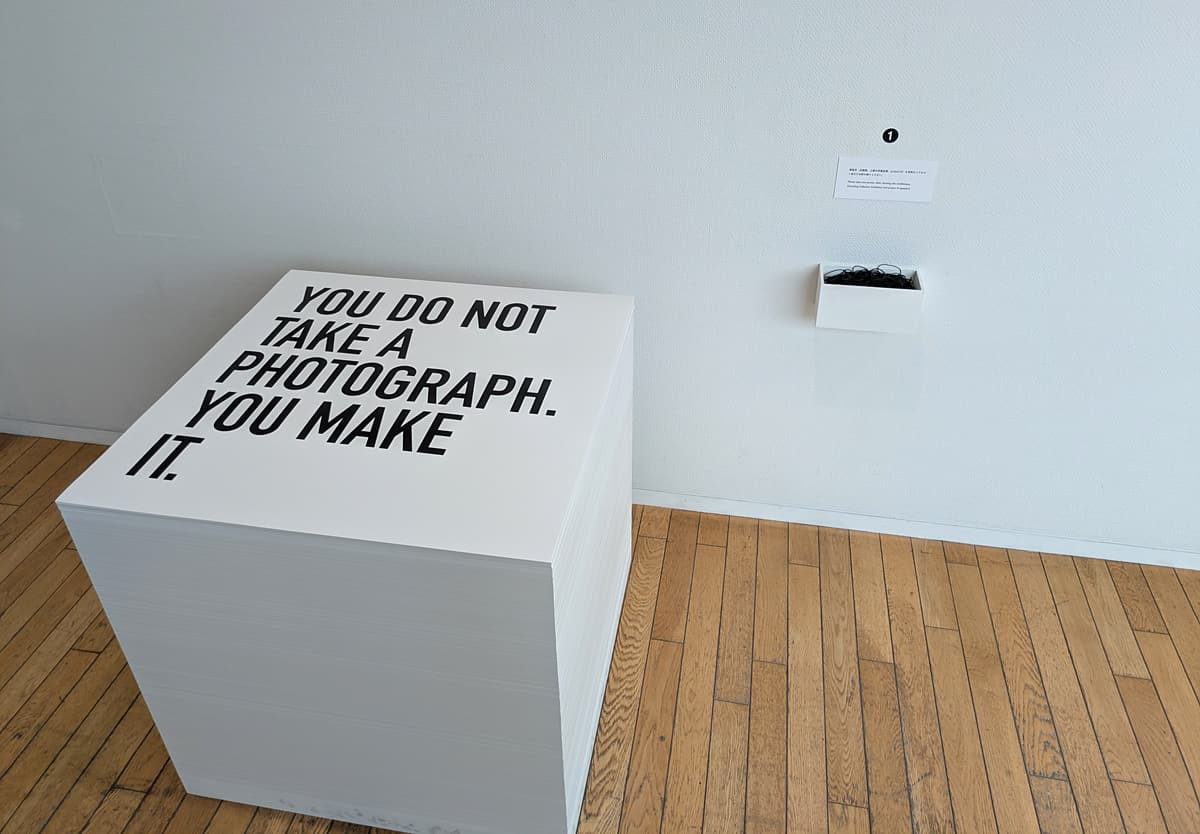 ●いちばんいいなと思ったのはこれ。「写真はとるのではない。つくるものだ」(2013)。これは展示の入り口に置かれていて、ポスターが積みあがっている。で、ぜんぶ見た後で、帰りに一枚持ち帰ることになっている(ちゃんと輪ゴムまで用意されている)。減った分は、またスタッフが補充して、立方体に近い形状が保たれるようになっているようだ。喜んで一枚もらって帰った。写真はとるのではなく、つくるもの。みんな、知っている。