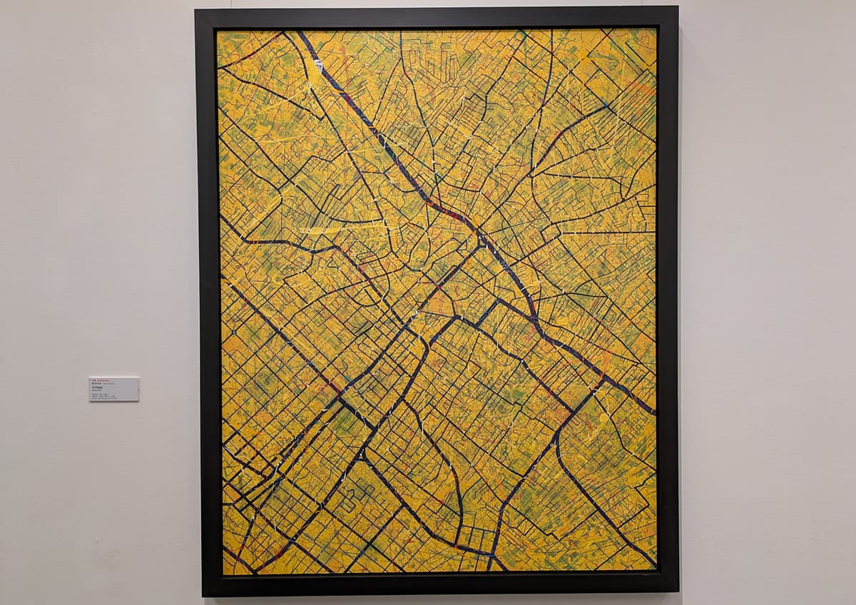 ●ぱっと見て地図とわかるが、タイトルは「ガザ地区」(原多夫志)。重いテーマと、洗練された表現。碁盤の目のような整然とした道ではなく、太い幹線道路から細い路地まで複雑に入り組んでおり、そこに人々の営みと歴史の積み重ねを感じさせる。