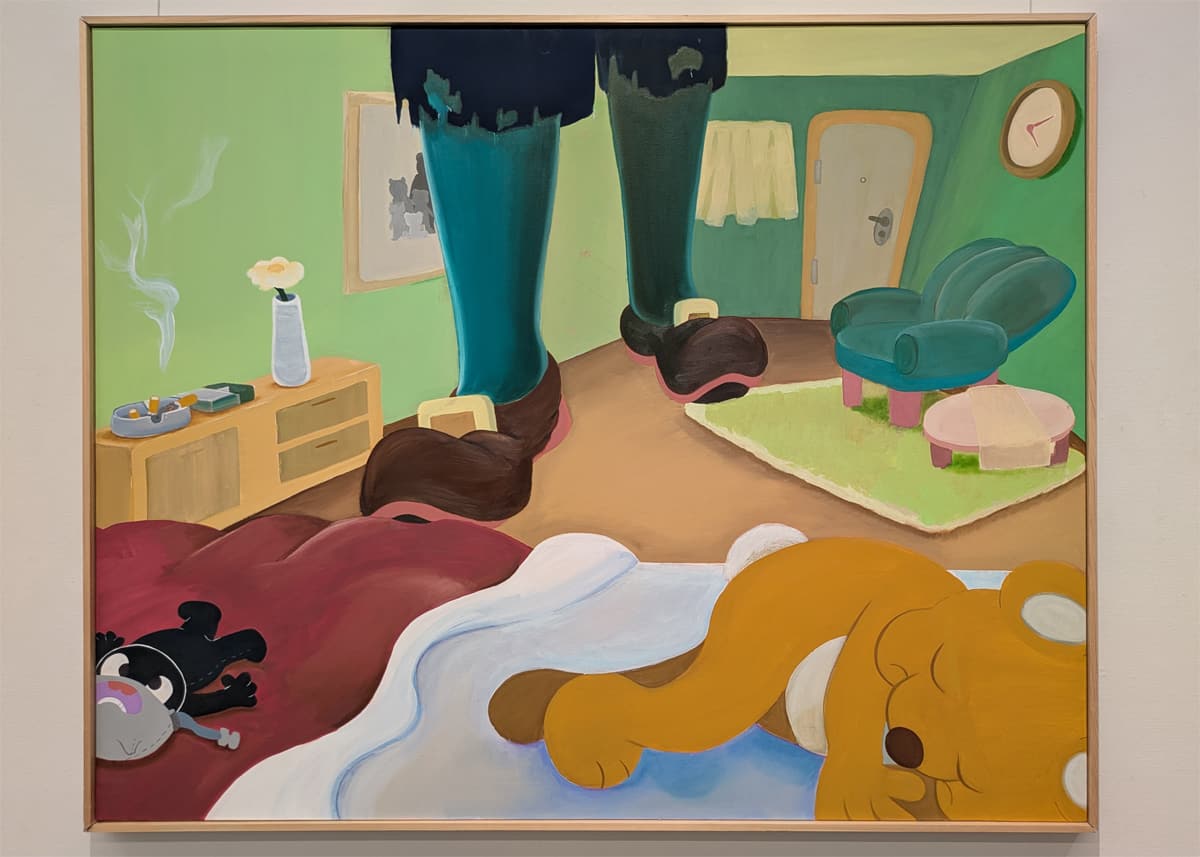 ●「くまの眠り」(本多愛実)。ほんわかとした「かわいい」タッチだが、これはどういう状況なのか。ベッドに気持ちよさそうに横たわるくまちゃんがいて、くまちゃんの持ち物らしきぬいぐるがあって、そのすぐそばに巨人が佇んでおり、灰皿には火のついたタバコ。すでにタバコは3本目。くまちゃんの目覚めを待っているのだろうか。灰皿のそばに置かれたオイルライターはタフガイを連想させる。物騒かもしれないし、そうでないかもしれない。この巨人はだれだ?