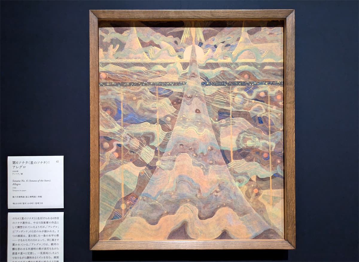 ●作曲家だけあって、音楽形式にちなんだ作品も多い。これは「第6ソナタ(星のソナタ):アレグロ」(1908)。本来4楽章の作品として構想されたが、アレグロとアンダンテの2点のみが描かれたという。こういった「ソナタ」だったり「前奏曲とフーガ」といった題を添えた絵がいくつもあるのだが、趣向に興味が持てるかというとそこは微妙なところ。ただ、これが連作の最初に配置されるアレグロ楽章だと言われれば、まあ、納得はできる。リズミカルで活発で、なにかが始まっている。ほとんどの作品はこういった彩度の低い色調。