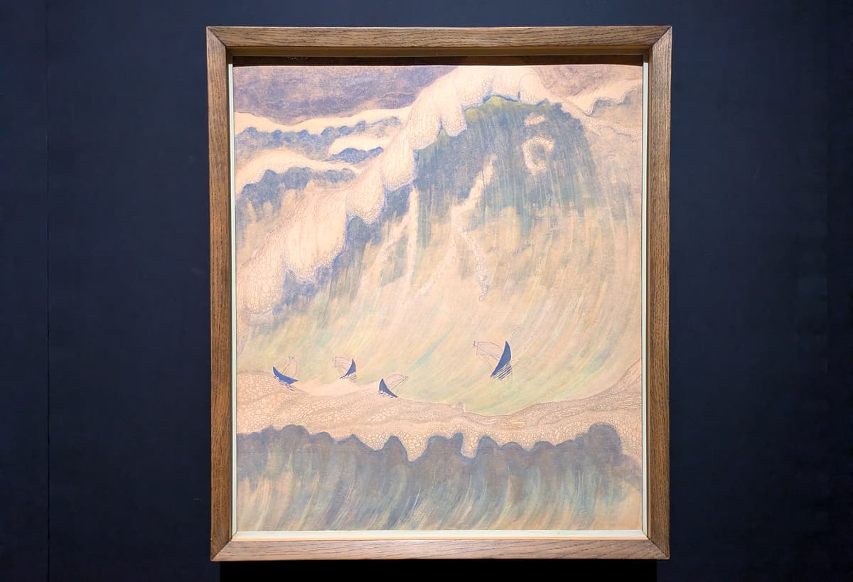 ●こちらは「第5ソナタ(海のソナタ):フィナーレ」(1908)。海がモチーフになっているのだが、葛飾北斎の「神奈川沖浪裏」を参照しているのだとか。実は作曲家チュルリョーニスには交響詩「海」(1907)という作品もある。この曲は録音がいくつもあるので簡単に聴けるのだが(たとえばBISのモデスタス・ピトレナス指揮リトアニア国立交響楽団など)、会場でループで流される冒頭部分が、一瞬、ドビュッシーの「海」みたいでギクッとする。ただ、全曲を聴くとだいぶ違った手触りで、思い切り後期ロマン派のスタイル。こんなところにもワーグナーの影響が。