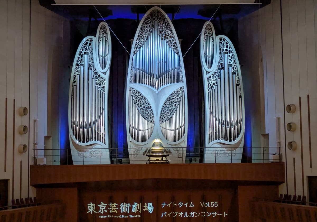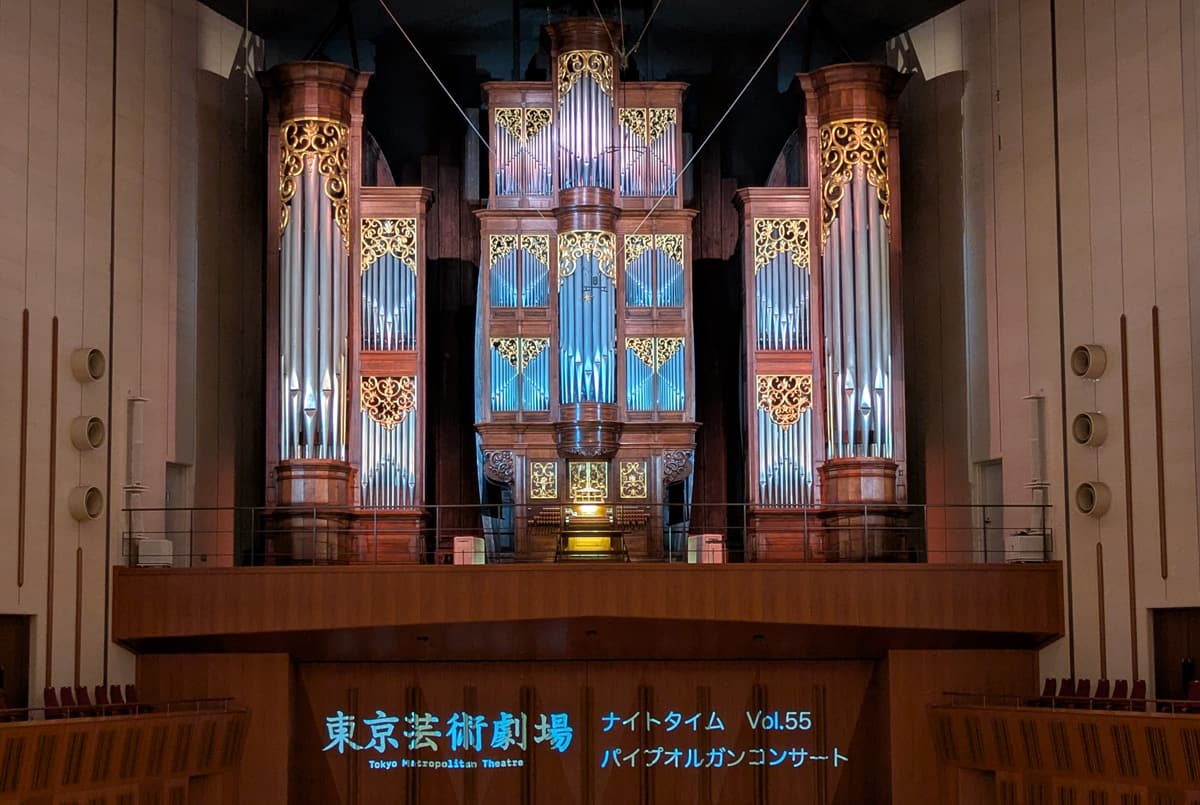 ●近年、芸劇はオーケストラのコンサートだと反響板を下ろしてオルガンが見えないことがほとんどだが、ここのオルガンはルネサンス/バロック面とモダン面の2面構成になっている。この日は上のようなルネサンス/バロック面で始まって、途中でオルガンが回転して(3分かかる)モダン面に変わった。うっすら漂う変形合体ロボ感。